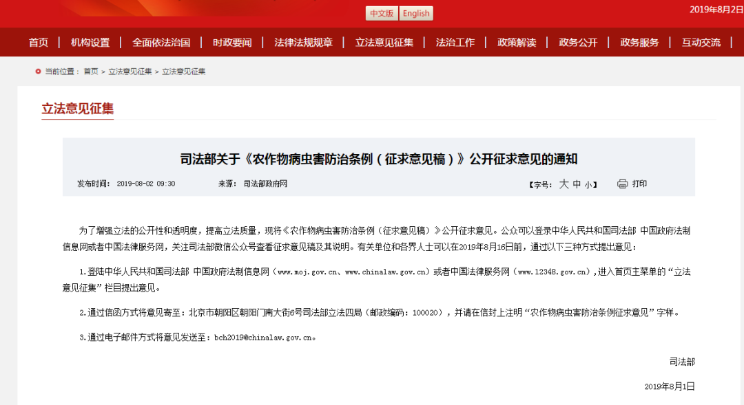 目前《农作物病虫害防治条例(征求意见稿)》,正在公开征求意见中。公众可以登录中华人民共和国司法部中国政府法制信息网或者中国法律服务网,关注司法部微信公众号查看征求意见稿及其说明。有关单位和各界人士可以在2019年8月16日前,通过登陆官网、邮寄信函、发送电子邮件三种方式提出意见。
