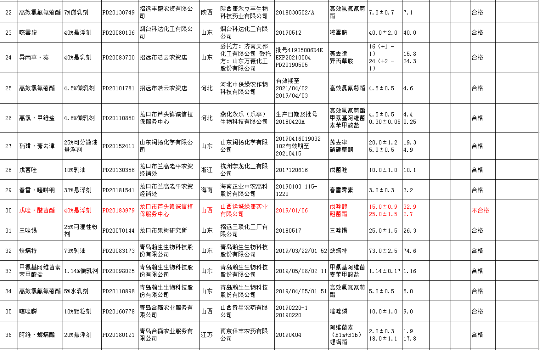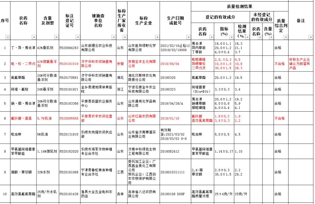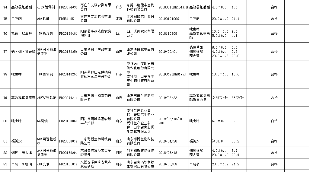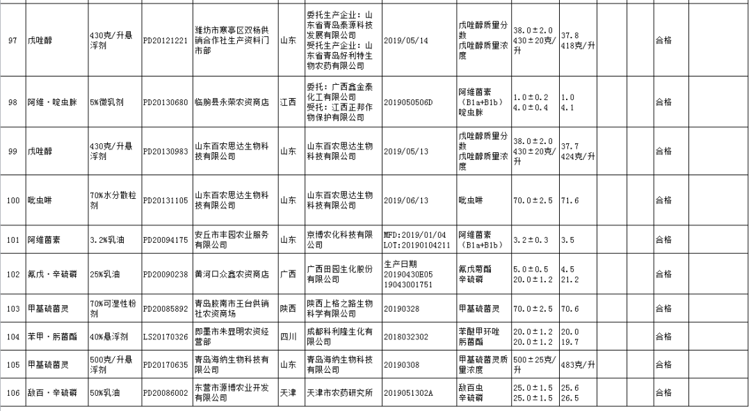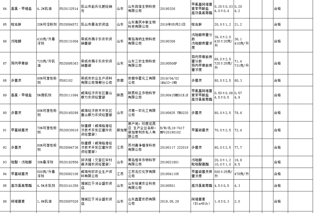本次通报共有106个批次的农药产品,涉及安徽、江苏、河北、河南、湖北、江西、陕西、吉林、山东等19个省(市)的89家农药生产企业和山东省12市72家农药经营单位。监督抽查范围包括农药市场和生产企业,市场抽查按照“双随机一公开”原则确定被抽查农药经营单位和农药品种,企业抽查在“双随机一公开”原则的基础上,结合近年来部省监督抽查结果,突出涉嫌存在问题的农药生产企业和农药品种。