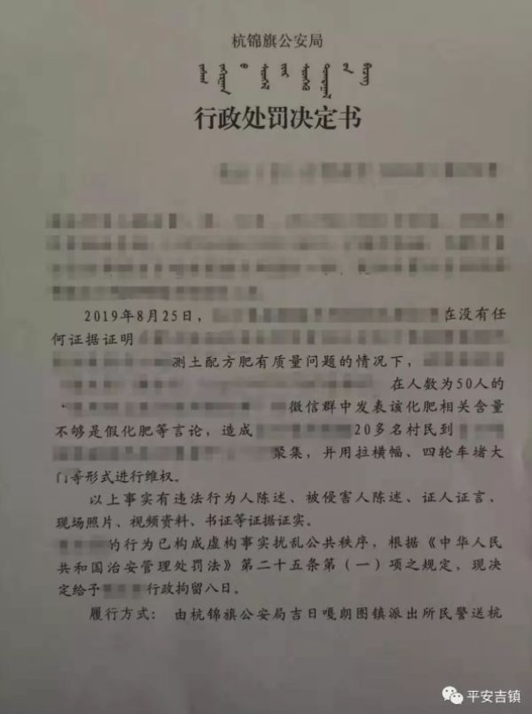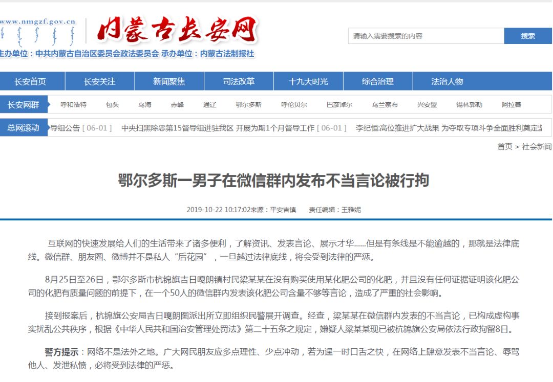 10月27日,内蒙古自治区鄂尔多斯市杭锦旗一村民被行拘的消息引发关注。传言其因在没有任何证据的情况下在微信群发表某化肥含量不够言论而被行拘。